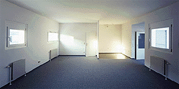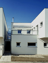 Dungls Konzept ist zweifellos rigoros. Er spielt mit seinen kleinen weißen Baukörpern ein System durch und versucht erst gar nicht, diese Tatsache zu verschleiern. Aber es wird einem nicht langweilig, dieses System, weil durch das Versetzen der signifikanten Wohnraumkuben eben doch Spannung aufkommt. Außerdem geben die schmalen Einschnitte zwischen den Baukörpern - mit dem Stiegenaufgang und der ganzen technischen Infrastruktur - einen ganz eigenen Rhythmus vor. Diese Einschnitte sollten ursprünglich nur mit Glasschuppen gedeckt, also relativ offen sein; das sind sie jetzt zwar nicht, aber auch mit geschlossenem Glasdach bleiben sie hell und freundlich und ein transparenter, dematerialisierter Kontrapunkt zwischen den Baukörpern.