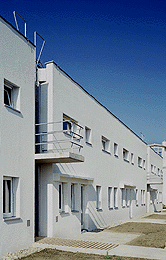 Gerade an diesen Eingangsbereichen merkt man übrigens, daß die Sorgfalt des Architekten dem Detail galt, man könnte auch sagen: der Schadensbegrenzung. Jeder Eingang ist durch eine Scheibe markiert, die Beleuchtung, Hausnummer und Briefkasten aufnimmt, wodurch die Beunruhigung durch allzu selbständige Accessoires wirksam vermieden ist.