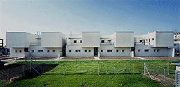 Dungls Wohnzeilen bestehen aus jeweils fünf Häusern und sind nach Süden, Richtung Gärtnerei, orientiert. Der Haustyp, den der Architekt für seine Bebauung entwickelt hat, sieht im Erdgeschoß jeweils eine Wohnung mit einem 50 Quadratmeter großen Garten vor und im Obergeschoß eine Wohnung mit einer 15 Quadratmeter großen Terrasse, wobei die Wohnungen jeweils umgekehrt orientiert sind. Das brachte den Vorteil, daß sich der Mieter im Erdgeschoß von oben uneingesehen in seinem Garten aufhalten kann; und es brachte den Vorteil, daß sich im Erdgeschoß zwischen Eingangssituation und Wohnbereich eine Raumschicht mit den Sekundärräumen einschieben ließ, was atmosphärisch ohne Zweifel etwas bringt.