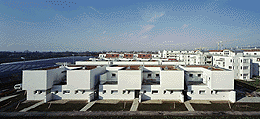 Aber auch wenn man von solcher Roßtäuscherei absieht, wird man der neuen Wohnanlage nicht froh. Sie liegt unmittelbar an der Stadtgrenze, wenn man den Blick schweifen läßt, sieht man das Glashaus einer Gärtnerei und Landschaft, sonst nichts. Es wäre also naheliegend gewesen, diesem Umstand mit einer niedrigen Bebauung Rechnung zu tragen, auf den Grünraum überzuleiten.