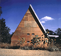 Die Schmalseiten des Hauses sind mit Holztafeln mit Nieten verkleidet, wobei sechs kleine Fensterschlitze - je zwei pro Etage - eingebaut wurden: Einerseits als Oberlichten für das Bad andererseits für zusätzliches Licht im Wohnbereich.