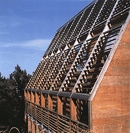 Die andere Schräge des Daches ist mit Lamellen aus Holz versehen, die sich auch noch als Terrassengeländer im Obergeschoss fortsetzen. So ist das Haus einerseits durch Beton, andererseits durch die Lamellenhaut geschützt. So kann man zwischen Lamellengerüst und Gebäude auf die Veranda treten, ohne sich beobachtet zu fühlen. Das einfallende Licht erzeugt auf dieser Seite ein interessantes Licht-Schattenspiel im Inneren des Hauses.