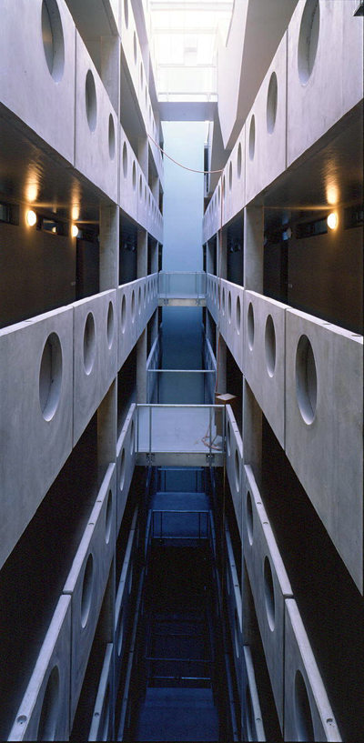 Es lohnt sich, den ARTEC-Bau mit Martin Kohlbauers unmittelbar angrenzendem Wohnbau zu vergleichen, einer weiß verputzten, klassische Stadtmuster zitierenden Anlage von annähernd gleicher Dichte. Der wesentliche Unterschied ist, daß ARTEC versuchen, eine dieser Dichte angemessene Bebauungsstruktur zu finden und nicht einfach noch mehr Wohnungen noch höher übereinanderzustapeln. Sie variieren dazu den Typus des „Passagenwohnhauses“: In den nord-südgerichteten Zeilen ist je eine über alle Geschoße reichende, mit einem Glasdach gedeckte Halle mit Galerien angeordnet, von denen aus die Wohnungen erschlossen werden.