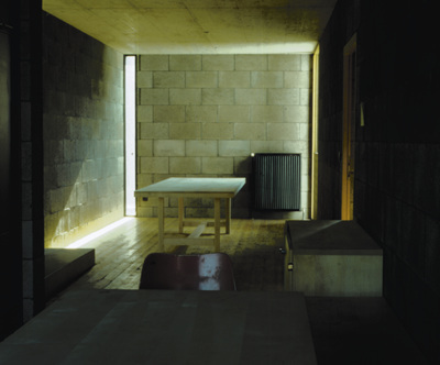 Eine steile Treppe trennt und verbindet gleichzeitig Alt- und Neubau. Sowohl innen als auch außen sind die Wände aus unverputztem Betonsteinmauerwerk, was dem Bau eine Bescheidenheit und Schlichtheit verleiht. Links im Zubau befindet sich das Treppenhaus zu den Schlafräumen, rechts gelangt man zur Küche und in den Eßbereich, der weiter in den etwas höher gelegenen Geminschaftsraum führt. Dieser ist sehr einfach gehalten, mit Sitzmobiliar, einem in das Mauerwerk intergrierten Kamin, hellem Holzboden und -decke und einer größzügigen Verglasung mit Holzeinfassungen und einer Holztüre, die ins Freie führt und gleichzeitig die Natur in den Raum bringt. Eine steile Treppe führt weiter in die Räume der Sozialarbeiter.