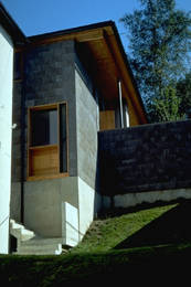 Das Grundstück befindet sich auf einem steilen Hang und der Zubau wurde hinter den Altbau gesetzt. Im Altbau befinden sich nun die Schlaf- und Sanitärräume, der Neubau beherbergt die Gemeinschaftsräume.