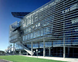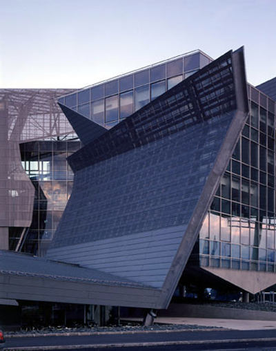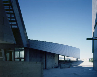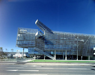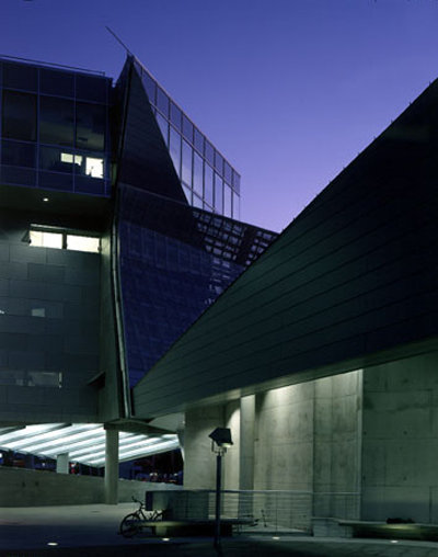 Nun ist die vollkommenste Bauskulptur in der Regel nicht zweckfrei, sondern muß bestimmte Anforderungen an Funktionalität erfüllen. Thom Mayne postuliert „function follows form“ und begründet schlüssig, dass sich die Funktionen stetig ändern und Anforderungen kein feststehendes Etwas sind. Sein Interesse liegt nicht in unmittelbarer Funktionserfüllung, vielmehr sieht er sein architektonisches Operationsfeld durch Termini wie Veränderung, Widersprüchlichkeit, Konflikt und Dynamik geprägt, die für ihn kennzeichnend für die gleichermaßen komplexen wie fragmentarischen Strukturen der Gesellschaft im ausgehenden 20.Jahrhundert sind. Und er scheint an unorthodoxen Räumen interessiert, die diese Dissonanz ausdrücken. Die Schalterhalle im Kundencenter spiegelt dies wider. Den erweiterten technischen Möglichkeiten unserer vernetzten Welt entsprechend könnte sie auf die Grösse eines Computerterminals reduziert sein. Die Architektur reagiert darauf, indem sie die Schalterhalle reduziert auf einen minimalen Servicebereich und die Schalter mit einer irritierend niedrigen Decke versieht. In den Bürobereichen allerdings bleibt der Architekt in einem erschreckenden Maß in hierarchischen Strukturen stecken. Das oberste Geschoß, die Vorstandsetage erweist sich, zumindest in den nach Süden orientierten Räumen als Bel Etage mit hohen, von allen Seiten durchsonnten Räumen. Die nach Norden gerichteten Büros aller Geschoße sind unterbelichtet und müssen tagsüber immer Kunstlicht zuschalten, weil sie einer rigiden formalen Entwurfsidee unterworfen sind. Ihre Fenster, liegende Elemente in der gleichen Form und Grösse wie die im Abstand davorgesetzten Klappen in der durchgehenden Lochblechhülle sind, ganz banal, einfach zu klein. Der Ausgewogenheit der Fassade und der Rythmik ihrer Öffnungen hätte es sicher nicht geschadet, wenn die hinter den Klappen liegenden Fensteröffnungen größer ausgefallen wären.