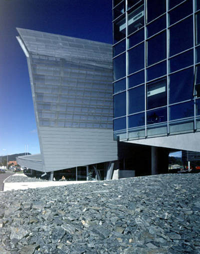 Das Gebäude der Konzernzentrale mit Bankfiliale am südlichen Rand des Areals betont seine städtebauliche Bedeutung am Kreuzungspunkt zweier Strassen durch Höhe, es ist fünfgeschossig, und Dichte. Einschnitte und Verschiebungen aus dem Erstentwurf erzeugen geknickte und schräg aufgeständerte, additiv angeordnete und miteinander verzahnte Bauteile, die ein skulpturales Ganzes ergeben. Fremd und irritierend ragt es an der östlichen Einfallsstrasse von Klagenfurt empor. Dynamisch durch die aufsteigende Schräge, fragmentarisch durch die Bruchlinien zwischen den einzelnen Trakten, gekrümmt, durchstossen und aus den Angeln gehoben evoziert das Gebilde die Kategorisierung „dekonstruktivistisch“. Der Architekt verwehrt sich allerdings dagegen und behauptete bei der persönlichen Führung anläßlich der feierlichen Eröffnung im September den Gebrauchswert sämtlicher Bauteile. Funktionell begründet wird auch das vertikale, weitgehend freistehende Wandelement - geknickter Insektenflügel - eine großteils mit Lochblech verkleidete Stahlstruktur, die in enger Nachbarschaft zur verglasten Stirnseite des langen Trakts an der Völkermarkter Strasse aufragt - als notwendig nutzloses Element (schelmisches Augenzwinkern konnte nicht bemerkt werden). Für mich ergab sich die Assoziation mit einer Felsspalte. Geheimnisvoller Eingang in die Welt des Monitarismus? Tatsächlich erfolgt der Zugang in den Verwaltungstrakt wie in die Bankfiliale für den zu Fuß Kommenden von dieser Seite. Auch hierbei scheint es um die Betonung des Skulpturalen zu gehen; die Einkerbung als präziser bildhauerischer Akt, der spannenden Ausblick verspricht.