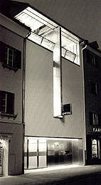 Die Südfassade nimmt First-, Traufen- und Dachflächen der Nachbargebäude auf und erzielt dadurch ein tektonisches Equilibrium der zum Hauptplatz orientierten Gebäude ohne die historisierenden Fassadenelemente zu berücksichtigen. Das Dreieck der N-Fassade schwebt hermetisch in einer gewachsenen und geometrisch zufälligen architektonischen Landschaft der hinteren Fassaden von den Nachbarbauten.