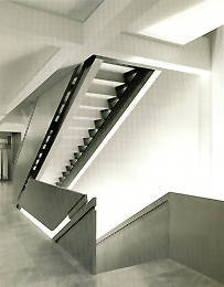 Die durch die N-S-Fassade definierten Eingangstore bilden im EG eine Passage und metaphorische Brücke, die die im gegenwärtigen wie auch im historischen Zusammenhang unterschiedlichen Bereiche der Stadt verbindet. Ein offener Stiegenlauf führt von der erdgeschoßigen Kassenhalle zu allen übrigen öffentlich zugänglichen Geschoßebenen.