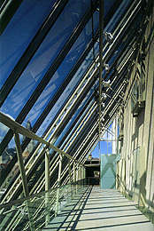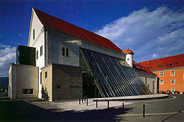 Der Umbau der 90-er Jahre ließ nur die beiden Eingangsbauten bestehen, wobei ein schräger, bis auf den Boden reichender, voll verglaster Zubau angedockt wurde, der als Foyerraum dient und die Fensterfassade des Altbaus nach außen durchscheinen läßt, was einen interessanten Aspekt zwischen alter und neuer Substanz erhält. Etwas rückversetzt zu dem Glasbau befindet sich gleich daneben der verglaste Eingang.