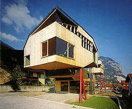 Konstruktion: Stahlbeton, Stahl, Holztafelelemente. Energieversorgung: passive Sonnenergie, aktiver Luftkollektor ( Profilitverglasung ).