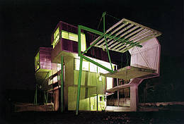 Im Erdgeschoss wurde nur ein Teil der Grundstücksfläche bebaut, die volle Ausnutzung erfolgt im Obergeschoss, wo die auskragenden Körper auf roten Stahlstützen stehen, die sich teilweise im Inneren des Hauses fortsetzen. So wird das Erdgeschoss auch als Garten und geschützter Terrassenbereich genützt.