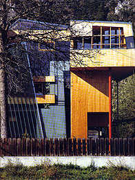 Natürlich hat es nichts mit den umliegenden Einfamilienhäusern im traditionellen Stil zu tun, und dennoch sind die Bezüge da: ausgehend von einem abstrakten Raummodell, wurde ein räumliches Schattenprofil der Schattenwürfe der umliegenden Häuser auf das Grundstück analysiert und in die dritte Dimension umgesetzt. So ist ein Haus aus drei Körpern entstanden, dessen Gerüst aus Stahlbetonscheiben besteht, das mit vorfabrizierten Holzelementen ausgefüllt wurde.