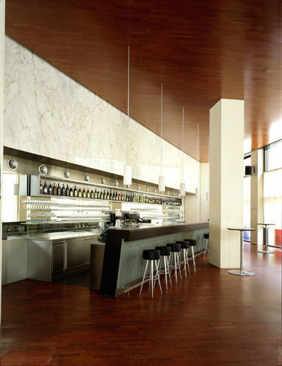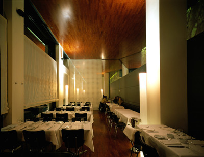 Claudia König und Werner Larch, aus Vorarlberg stammend, in Wien ausgebildet und arbeitend, auch schon an mehreren realisierten Projekten erfahren, nutzen das Potential des Ecklokals trefflich. Um die fast widersprüchlichen Voraussetzungen für kulinarischen Genuß im Restaurant mit denen für den alltäglichen Umgang im Café und an der Bar zu vereinen, setzen sie auf einen großzügige Halle, die in fließend ineinander übergehende funktionale Zonen gegliedert ist. - Das Mietwohnhaus an der Ecke Laudon- und Daungasse, ein um 1905 errichteter, für diese Zeit technisch beeindruckender Stahlbetonbau mit vier Stöcken, bietet im Erdgeschoß einen stützenarmen Raum, dessen Qualitäten zuvor durch die massiven Ausfachungen im Skelett nicht erkennbar sind. Das vorher darin befindliche Rotlichtlokal war zuvor mehr auf hermetische Abschließung, denn auf Öffnung zur Straße bedacht.