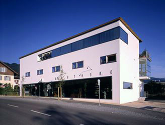 Ein nettes Detail weisen noch die einzelnen Verglasungen auf, wo jeweils nur die öffenbaren Teile eine Holzrahmung innerhalb der Aluminiumaußenrahmung aufweisen. Die Inneneinrichtung für Apotheke und Wohnung stammt ebenfalls vom Architekten.