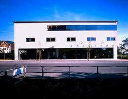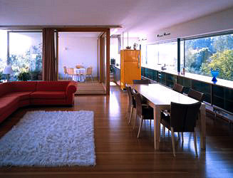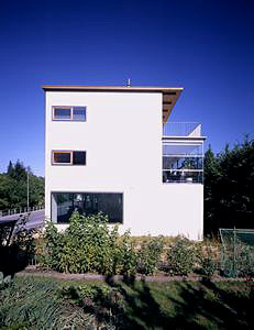 Unterhalb der Terrasse im 1. Obergeschoss wurde die Südseite über Eck vollverglast, wobei ein Ende leicht auskragt, wodurch einerseits die strenge kubische Form des Hauses aufbricht und andererseits ein schützendes Dach für den Eingangsbereich im Erdgeschoss darstellt.