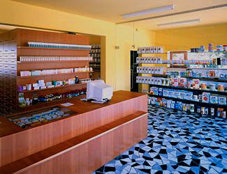 Die Straßenfassade der Apotheke ist vollverglast und gibt völligen Einblick in das Verkaufsgeschehen, sowie in das angrenzende Labor der Apotheke, was einen besonderen Reiz hat und sehr ungewöhnlich ist.