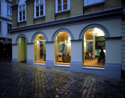 Das hätte zu einer städtebaulichen Schwachstelle werden können. Aber Markus Geiswinkler und Kinayeh Geiswinkler-Aziz haben dieses Problem mit einem unauffälligen, umso raffinierteren Kunstgriff gelöst. Sie haben die Arkaden verglast, wobei die Arkadenbögen außen unangetastet blieben und sich von innen die neu eingesetzten großen Glasscheiben als orthogonale Einheit abbilden. Ungewöhnlich: Das Lokal hat nicht einen, sondern zwei Eingänge, die an den Zugängen zur ehemaligen Arkade plaziert und in der warmen Jahreszeit vollständig zu öffnen sind: eine Aufforderung an die Passanten, einfach durchzugehen und einen Eindruck vom Verkaufsangebot der Galerie Image mitzunehmen.