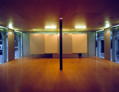 Die räumliche Strukturierung ist so simpel - und praktikabel - wie möglich. Der eigentliche Galerie- beziehungsweise Verkaufsraum mit seinen beiden Eingängen hat die Form eines Rechtecks, an dessen hinterer Längsseite die multifunktionale, dreischichtige Präsentationswand als Hauptelement plaziert ist. Sie erfüllt übrigens eine zusätzliche Funktion, denn sie deckt gleichzeitig einen kleinen Arbeitsplatz auf der einen Seite und auf der anderen Stau- und Technikraum, Teeküche und das WC ab. Diese dienenden Bereiche sind dabei als sehr schlichte Box formuliert, die in den Raum hineingestellt wurde.