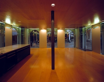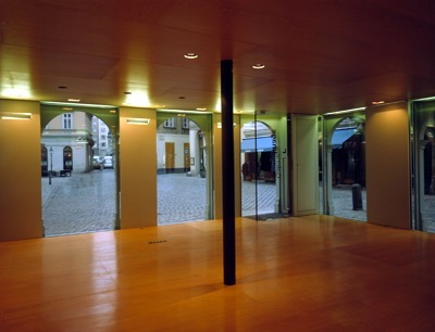 Tatsächlich lassen sich mit dieser Methode - im Gegensatz zu den Pioniertagen - ausgezeichnete Ergebnisse erzielen. Sie haben allerdings eines zur Voraussetzung: sehr viel und sehr genaue Planungsarbeit. Und bei einem Umbau vorhandener Bausubstanz stößt man damit möglicherweise immer wieder an Grenzen, weil es dabei zu unvorhersehbaren Schwierigkeiten, zu Unregelmäßigkeiten kommt. Darauf muß man dann flexibel und rasch reagieren. Die Wandpaneele zwischen den Arkadenpfeilern etwa sind alle vorgefertigt und gleich dimensioniert, die Pfeiler selbst - wiewohl aus den siebziger Jahren - sind das nicht. Daher gibt es stellenweise einen kleinen Überstand, der den Eindruck erweckt, diese Paneele seien verschiebbar. Das ist ein Effekt, der den Betrachter in die Irre leitet und keineswegs reizlos ist. Oder: Der neue, durch eine Fuge vom Bestand abgesetzte Sperrholzboden wurde über den alten gebaut und mußte durch eine minimale Schräge auf das Niveaugefälle zum Gehsteig draußen übergeleitet werden. Schließlich sind plötzlich Kellerbelüftungen aufgetaucht, die in keinem Plan verzeichnet waren und nun als „neue“ Elemente in „alter“ (aber nicht historisierender, sondern eher selbstverständlicher) Manier in die Fassade integriert sind, einfach so, als wären sie immer schon da gewesen.