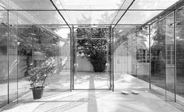 Bulant-Kamenova und Wailzer haben das Ansinnen ihrer Auftraggeber regelrecht auf den Punkt gebracht. Der von ihnen entworfene und in geklebter Konstruktion entwickelte Ganzglaspavillon ist dem von diversen Vorbauten und Zierrat befreiten Haus wie zur Veredelung vorgelagert. Dabei wird die kubische Wirkung des strahlend weißen Baukörpers eher noch verstärkt, als daß sie durch den Annexbau formal bedrängt würde. Dies ist kein klassischer Wintergarten, der als Anhängsel des massiven Baus wirkt, sondern ein auf konstruktive und ästhetische Reduktion angelegtes Glashaus mit maximaler funktionaler Entsprechung im Sinne der Klassiker dieser Art - wie das „Farnsworth House“ von Mies van der Rohe oder das „Glass House“ von Philip Johnson.