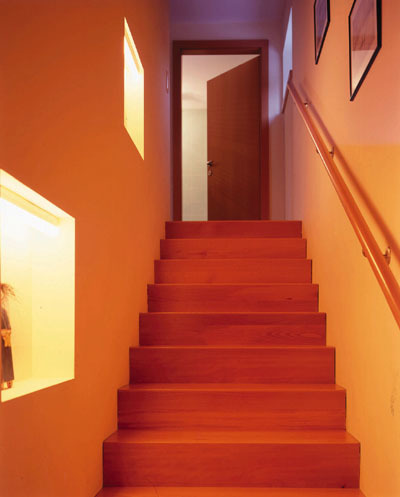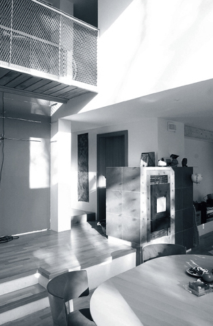Es ist bereits etwas Phantasie notwendig, um vom Äußeren auf das - übrigens sehr weitläufige, aber dennoch in vielfältige Rückzugsbereiche gegliederte - Innere zu schließen. Die große Überraschung kommt aber ganz oben. Hier liegt nur ein Arbeitsraum, umgeben von einer breiten, nach Süden und Osten orientierten Dachterrasse. Sie dient als uneinsehbares Sonnendeck und luftiger Kinderspielplatz.