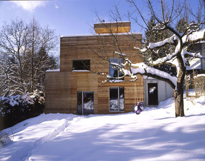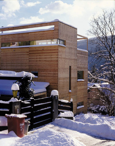 Eines davon in Öhling von den Architekten Poppe und Prehal wurde bereits vorgestellt (DER STANDARD, 10. 11. 2001). Das zweite stammt von Architekt Thomas Abendroth und zeigt ebenfalls, dass die architektonische Qualität nicht unbedingt unter den Zwängen der Ökologie k.o. gehen muss. Es füllt eine schmale Baulücke in einer historisch gewachsenen Siedlung, wie sie für den Wienerwald typisch ist. Die mögliche Breite wurde ausgenutzt, dennoch wirkt das Haus nicht ins Grundstück hineingezwängt.