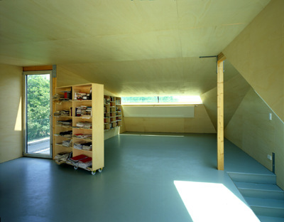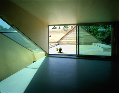 Von der verfügbaren Fläche über dem Altbau ist nur eine Hälfte ausgebaut, die andere bleibt frei als Terrasse zwischen dem Studierraum und der Giebelwand des benachbarten Dachs. Ein Oberlicht an der Nordseite der Terrasse bringt Licht hinunter in den zweiten geforderten Funktionsraum, das Badezimmer. Hier finden sich dieselben Materialien wie im ersten Stock: ein grüner Gummiboden und Pappelsperrholz, zusätzlich Aluminiumplatten an den Wänden. Die Beschränkung bei der Farb- und Materialwahl wirkt aber keineswegs spartanisch: Weil durch die leicht getönten Gläser Licht aus verschiedenen Richtungen auf die Oberflächen fällt, entstehen feine Farbnuancen und -überlagerungen. Auch die Außenflächen werden sich im Lauf der Jahre verändern: Die Aluminiumplatten sind nicht eloxiert und werden je nach Bewitterung eine dunklere Tönung bekommen.