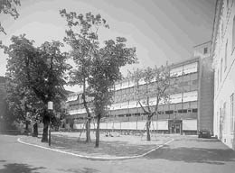 Ästhetisch reizvoll ist das Fassadenbild dieser gläsernen „Vorgelege“. Durchsichtige Glasflächen wechseln mit grünlich-opaken ab, die zu öffnenden Glasteile stechen rot hervor, textile weiße Jalousien sorgen für einen zusätzlichen Akzent. Auch das Problem des Anschlusses dieser „Vorgelege“ an die angrenzenden Fassaden ist ausgezeichnet gelöst. Sie rücken geringfügig davon ab, wobei das Ende der Glashaut durch ein „Einschubelement“ mit Eternitverkleidung ganz unauffällig formuliert ist.