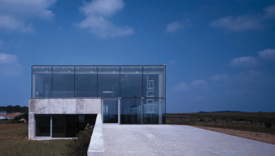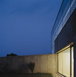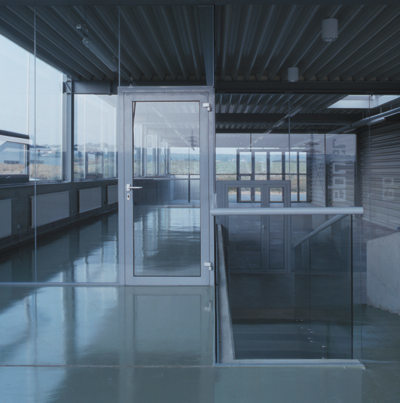 Die Halle selbst ist als nach Süden und nach oben geschlossener Winkel konstruiert, wobei ein Glasschlitz an der Südostecke und das durchgehende Glasband an der Nordwestseite mit den voll verglasten Stirnseiten für gute Belichtung und intensive Blickbeziehungen zur Umgebung sorgen. Analog zur Homogenität des Betonsockels ist auch der Hallenwinkel außen und innen in Blech ausgeführt. (Text: Otto Kapfinger, 21.09.2000)