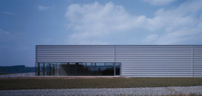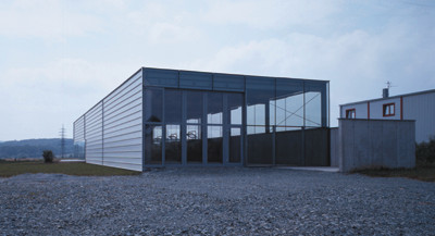 Der Kundenzugang wird von der Straße entlang einer Böschungswand über eine Betonrampe hochgeführt zur Stirnseite der Halle. Zugleich verformt diese Rampe das Gelände zu einer fast geschoßhohen Stufe, deren unteres Niveau als Betonkörper halbhoch in die Halle eindringt, dort eine Galerie mit Büro und speziellen Arbeitsräumen definiert und die Nordwestand entlang als Außenwand in halber Höhe weiter- und über das Hallenende hinausläuft, während das obere Niveau glatt durch die Halle hindurch zur Hinterseite und zum anschließenden Verladeplateau führt. Unter der Galerie eingeschoben ergibt sich ein sehr schöner Sozialraum für die Belegschaft mit breiter Glaswand und Ausgang zur Wiese.