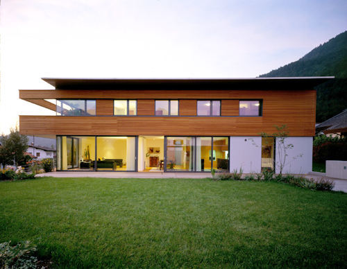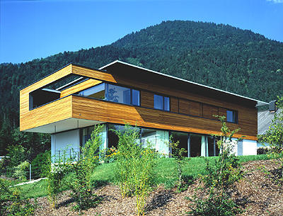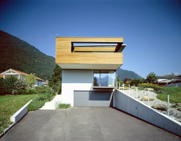 Der betonte Dualismus zwischen der massiven, weiß verputzten Sockelzone mit den verglasten Wandelementen im Erdgeschoss und dem im Westen ausladendem, lärchenholzverschalten Obergeschoss verweist auch auf die innenräumliche, klassische Funktionsgliederung mit einem fließenden Nebeneinander von Kochen, Essen und Wohnen im nach Süden offenen Erdgeschoss und dem „Sich-zur-Ruhe-Begeben“ im (gegenüber dem Sockelgeschoss auch in der Raumhöhe etwas herabgesetzten) Obergeschoss, das im Westen in einen intimen Terrassenraum ausläuft. Die nordseitige Erschließung ist vom Wohnbereich klar getrennt, die Breite des Ganges wertet den Vorraum im Obergeschoss zum nicht eindeutig besetzten Wohnraum auf. Handwerkliche Sorgfalt im Innenausbau und das ruhige architekonische Konzept heben dieses Haus wohltuend aus dem platzgreifenden, bewusstlosen baulichen Umfeld heraus. (Text: Gabriele Kaiser)