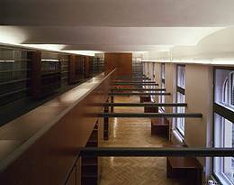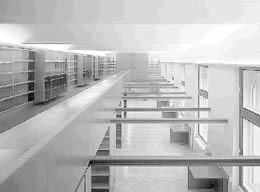 Die Bibliothek selbst liegt im Geschoß darüber und drückt sich im Gang durch eine vorgeschobene gläserne Schicht aus, die aus zwölf zwei Meter langen Glastafelnbesteht,also24 Meter lang ist. An einem Verwaltungsbereich vorbei kommt man unter der neu eingeführten Galerie in den hohen, von allen Zwischenwänden befreiten Raum hinein. Die Bibliotheksregale schauen wie Finger in den Raum,ein Lesepult mit Ablagefläche ist zwischen die tragende Innenmauer und diese Regale geschoben, sodaß der Raum in seiner gesamten Länge nachvollziehbar und überschaubar ist. Über diesen Lesepulten hat sich eine gelochte Holzdecke – wie alle Holzeinbauten aus Betonschaltafeln – inzwischen als sinnvolle akustische Maßnahme herausgestellt.