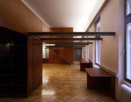 Als Artec – das sind Bettina Götz und Richard Manahl – mit der Aufgabe konfrontiert wurden, hier eine neue Bibliothek einzurichten, war dann auch das erste, was ihnen bei der Gebäudebegehung auffiel, die fundamentale Notwendigkeit der Neuorganisation innerhalb des Bauwerks. Immerhin – für diesen Vorschlag fanden sie offene Ohren, und in derFolge war es möglich, die 4,80 Meter hohe Beletage soweit freizubekommen, daß eine zentrale Bibliothek eingerichtet werden konnte.