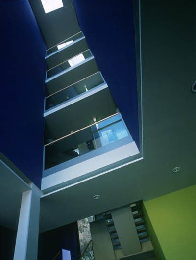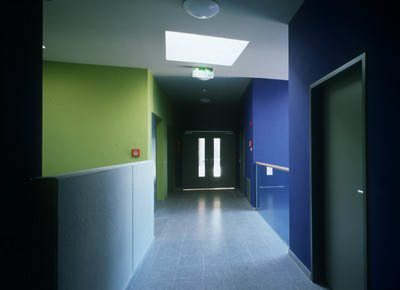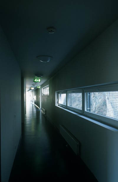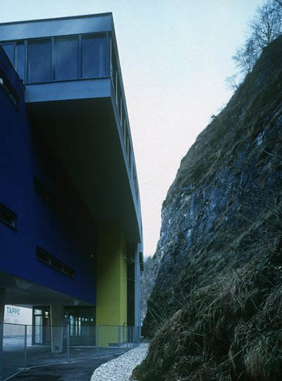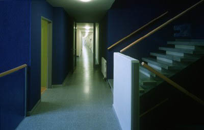 Die Erschließung erfolgt über Gänge, die jeweils die ganze Gebäudelänge durchlaufen und der Bergseite zugewandt sind. Schöne Effekte, die Natur miteinzubeziehen, sind z.B. die horizontalen und vertikalen Fensterbänder sowie die über Eck Verglasungen an der Süd-West Seite, die unterschiedlichste Ausblicke auf Berg, Stadt und Umgebung zulassen und den Bewohner auf dem Weg in sein Zimmer begleiten. Diese sind alle nordseitig ausgerichtet. Die dem Berg abgewandte Seite ist aber dafür vollverglast, mit blau emaillierten Einsätzen, und bietet maximalen Lichteinfall für die Bewohner. Diese geschwungene Fassade ist nur einmal eingeschnitten, dort nämlich, wo sich der Haupteingang befindet.