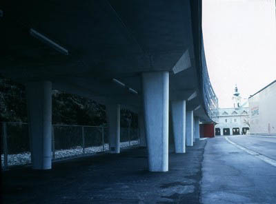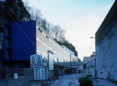 Das Gebäude selber steht direkt an der Nordseite des Kapuzinerberges, praktisch in seinem Windschatten und macht in Ost-West Ausrichtung die Schwingung des Berges mit. Zusätzlich wurde der langgezogene Bau auf Betonstützen gestellt, was ihm einen schwebenden Charakter verleiht und das freie Erdgeschoss Raum für Geschäfte und Marktstände bietet.