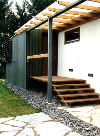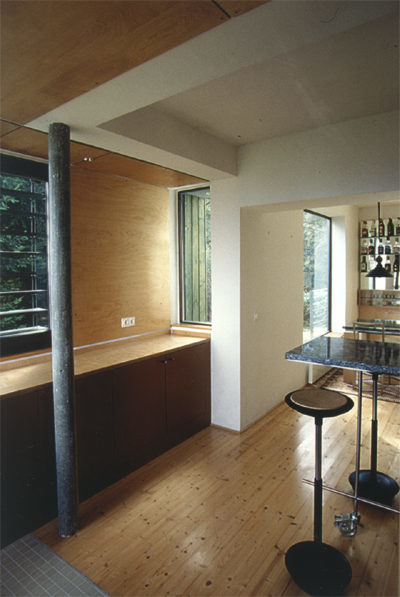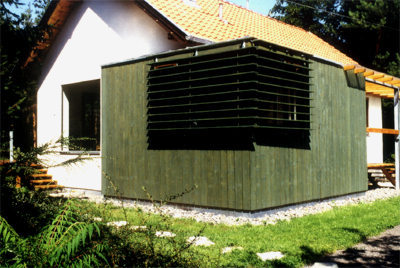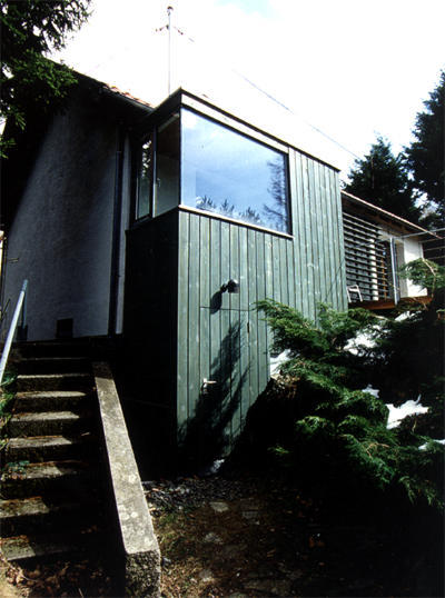 Die neuen Gebäudeteile sind Holzkonstruktionen mit Flachdach und wurden zum Altbestand versetzt hinzuaddiert. Dadurch durchdringen die neuen Teile teilweise den Altbestand, wirken aber keineswegs aufdringlich oder bestimmend – im Gegenteil: es entstanden neue Licht- und Sichtbeziehungen und fließende Übergänge vom Alt- in den Neubestand. Der Neubau selber tritt in seiner dezenten Gestaltung eher zurück und passt sich in seiner Farbe dem Grün der Umgebung an.