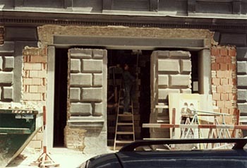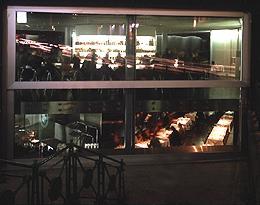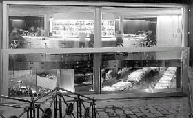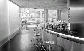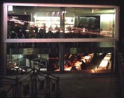 Der „Guess-Club“ erstreckt sich über zwei Ebenen und hat folgerichtig zwei Eingänge. Oben geht es in die Bar, unten, am Fuß der Treppe, ins Restaurant. Intern sind beide Ebenen natürlich ebenfalls verbunden, können im Fall spezieller Veranstaltungen in der Bar aber problemlos getrennt werden. Zur Stadt hin blickt ein gewaltiges Schaufenster - acht mal fünf Meter - , das beide Ebenen einsehbar macht. Es ist zweigeteilt und läßt sich im Barbereich aufschieben: Mit Hilfe eines Elektromotors fahren die 800 Kilogramm Glas der oberen Scheibe geräuschlos hinunter.