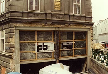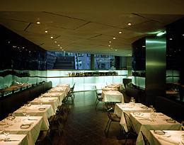 Grundsätzlich sind die Materialien, die man in der Bar vorfindet, bis in das Restaurant im Untergeschoß durchgezogen. Die Anordnung der Tische - jeweils an den Wänden entlang - wirkt hier durch einen leichten, eleganten Schwung wie eine großzügig einladende Geste. Ein kleiner Teil des ursprünglichen Gewölbes korrespondiert homogen mit den alten Ziegelmauern, die nur abgeschlagen, aber nicht verputzt wurden. Trotzdem kommt keine rustikale Kelleratmosphäre auf. Dem rauhen Mauerwerk ist nämlich eine dunkle Plexiglasbahn vorgespannt, eine artifizielle „zweite Haut“ sozusagen.