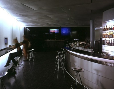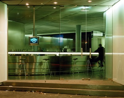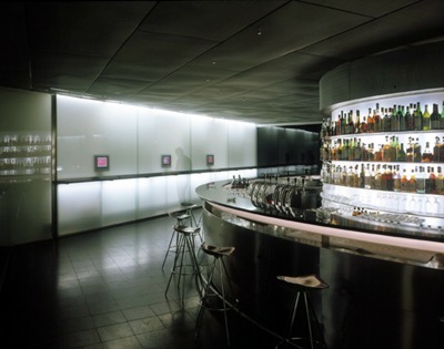 Die Bar ist schlicht schön: hinterleuchtetes Glas, vie- le Flaschen, angenehm für jedes Auge. Der große, durchlässige Raum wurde geradezu leger behandelt. Sehr dunkler Kunststein auf dem Boden, ein metallisches Gittergeflecht an der Decke, schwarzer Granit an der Bar. Und Glas in allen Variationen: als hinterleuchtete Milchglasscheiben, als durchsichtige Screens, als dunkles, fast schwarzes Plexiglas-Kleid und als schwarze Wand, die gleichzeitig Projektionsfläche ist. Denn das ist das Besondere dieser Bar: Sie treibt mit den technologischen Möglichkeiten von heute ihr Spiel.