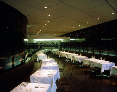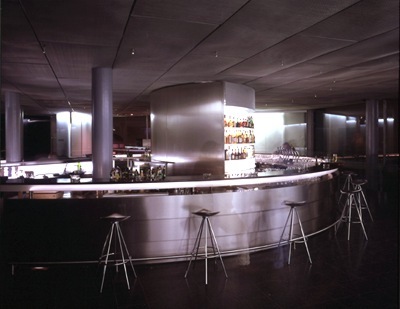 Die Architekten haben bei der Möblierung der Bar auch das Detail beachtet. Man sitzt auf Barhockern von Castiglioni, und die Stühle stammen von Charles Eames. Nur die Sitzbänke sind ein maßgeschneiderter Entwurf. Feinheiten lassen sich dabei erst ausfindig machen, wenn man ins Restaurant hinuntergeht und dort auf die gleiche Möblierung trifft. Denn dort haben die Eames-Sessel ein Sitzkissen, und die Rückenlehne der Bänke ist eine Spur stärker geneigt als oben. Bequemlichkeit ist also angesagt.
