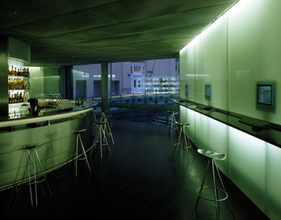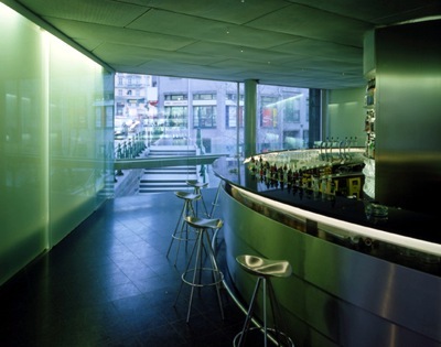 Im Barbereich selbst ist die solcherart gewollte städtische Schlucht nur durch eine Glasbrüstung ohne Handlauf konterkariert, von weitem teilt sich diese notwendige Sicherheitsmaßnahme also gar nicht mit. Da steht man und schaut verwundert, auch ein wenig irritiert hinüber, und man fragt sich: Ja, darf denn das sein? Das vorrangige Thema ist damit aber klar definiert: Der Innen-außen-Bezug wurde hier mit ungewöhnlicher Schärfe in Szene gesetzt.