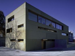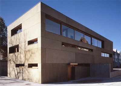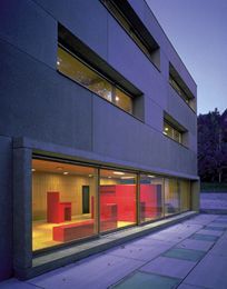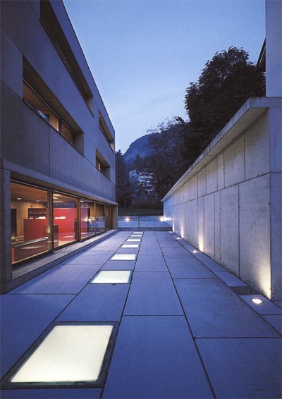Die verspielte Zufälligkeit der Schatten widerspricht dem massiven, ruhenden Eindruck der Aussenfassade. Grosse gelbeingefärbte, sandgestrahlte Betonelemente scheinen von Zyklopenhand aufgeschichtet, unverrückbar.