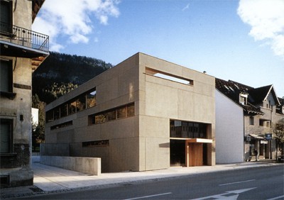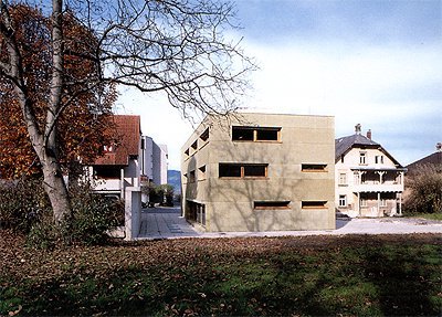 Die Bank offeriert der Strasse bescheiden ihre Schmalseite, lädt jedoch mittels eines grosszügigen zweigeschossigen Schaufensters zum Eintreten ein. Der grosszügige Raumeindruck wird durch eine klare Grundrissorganisation aller drei Obergeschosse ermöglicht. Sämtliche zudienenden Räume (Erschließung, WC, Archiv etc) sind in einer schmalen ostorientierten Raumzone untergebracht. Die Hauptraumzone muss so nicht verstellt werden. Die Haustechnikzentrale ist auf dem Dach situiert . Die Erschließungsleitungen werden in einer Schrankwand entlang der Nebenraumzone nach unten geführt.