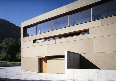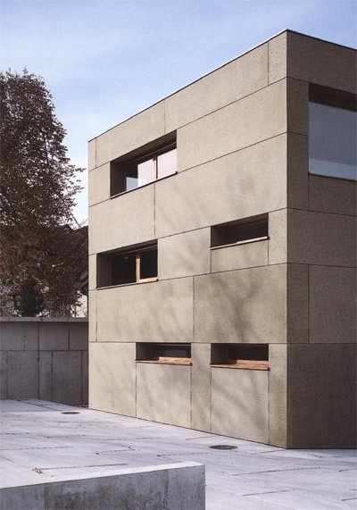 Die unregelmässige Anordnung der Fensteröffnungen unterstützt den monolithischen Charakter des Gebäudes. Die Tief in die Leibung eingelassenen Eichenfenster (Kippfenster in den Obergeschossen, Schiebefenser im Erdgeschoss) erhöhen die Plastizität des Baukörpers, indem sie ein vielfältiges Schattenspiel an der Fassade zulassen.