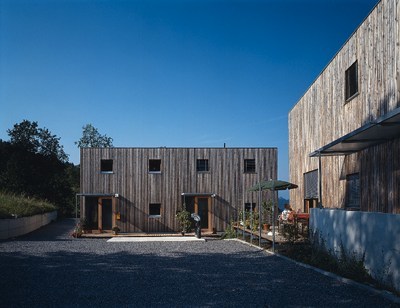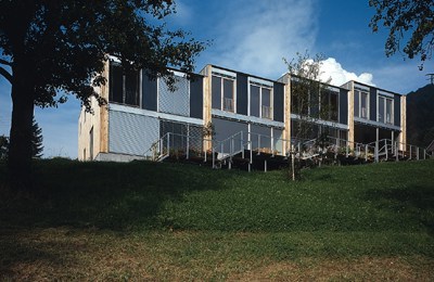 Die Südfassade ist fast vollverglast, Terrassen werden über Stahlstützen auf dem ansteigenden Gelände getragen, die Nordeingangsseite ist nur mit kleinen Öffnungen versehen. Diese optimale Sonnenausnutzung läßt auf Heizungssysteme verzichten, die nötige Wärme wird durch ein ausgeklügeltes Lüftungssystem gewonnen.