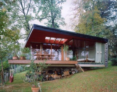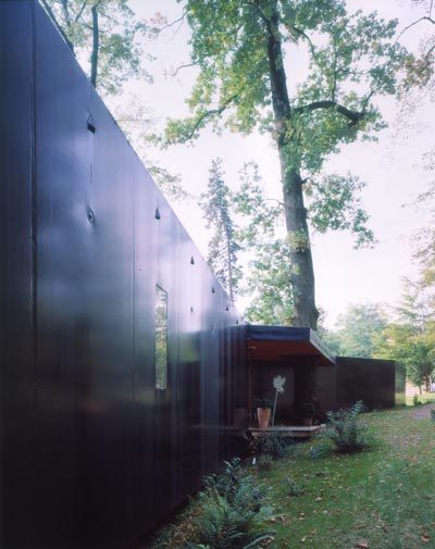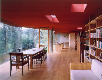 Die Ost-, Süd- und Westseiten sind komplett raumhoch verglast, sodass alle Aufenthalts- und Schlafbereiche uneingeschränkten Blick auf die bewaldeten Hügel der Umgebung haben. Der Innenraum ist nahezu stützenfrei, was durch einen 17,2 Meter langen Fachwerküberzug aus Stahl möglich wurde; die nördliche Außenwand ist außen mit schwarzer Folie bespannt. Der jetzige Kinderteil im westlichen Bereich des Hauses ist separat über einen eigenen Eingang zugänglich – so kann dieser Teil bei Bedarf unabhängig von der übrigen Wohnfläche genutzt werden. (Text: Architekten)
