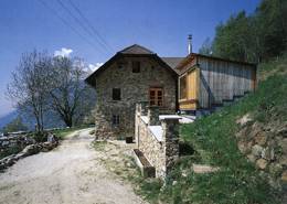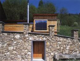 Der kleine Zubau steht auf einem Kellerraum mit Oberlichtverglasung. Die Verkleidung aus Lärchenholz, horizontal im Sauna- und vertikal im Badehausbereich, passt sich ausgezeichnet zur Steinarchitektur an und wird weiter in der Tür übernommen, die in das Kellergeschoß führt. Nur die Nordseite und das Flachdach des Badehauses sind mit einer Blechverkleidung bedacht, um ausreichend Isolierung zu gewährleisten.