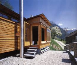Oberlichtfensterbänder begleiten die gesamte Länge des Saunabereiches, im Bad selber ist ein großes nach Süden ausgerichtetes Schiebefenster mit herrlichem Ausblick auf die gegenüberliegenden Berge und ins Tal eingepasst. Die Innenverkleidung des Bades besteht aus gemaserten Steinplatten, die vom Grundstück selber stammen.