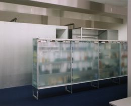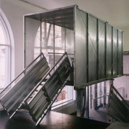 Dominantes Element des Mehrzweckraumes ist die Internetbox: Von vier langen, schlanken Stahlstützen getragen, steht sie im Eingangsbereich. Treppaufwärts, im Loungebereich, hat man auch Zutritt zu ihr: Wie ein Teil einer Röhre, wie abgeschnitten, die das Bild der multiplen Wiedergabe verdeutlichen soll. Diese Box, mit Lochblech ummantelt, definiert sich selber und beinhaltet vier Computerplätze für den gratis Zugang ins Internet.